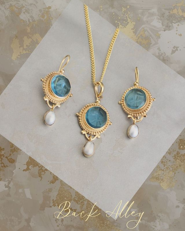 Blue Topaz Intaglio Necklace and Earrings 3-pc set