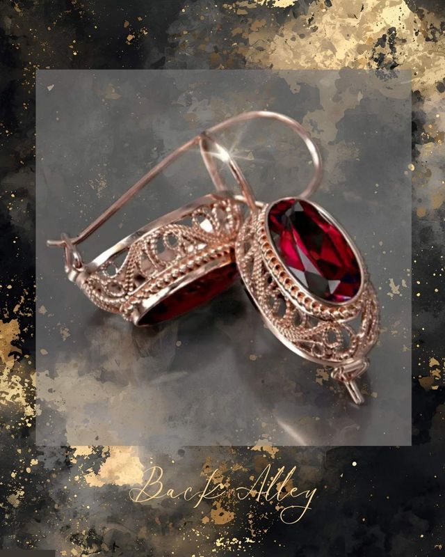 Regency Style Rose Gold simulated Oval Garnet Hoop Earrings.