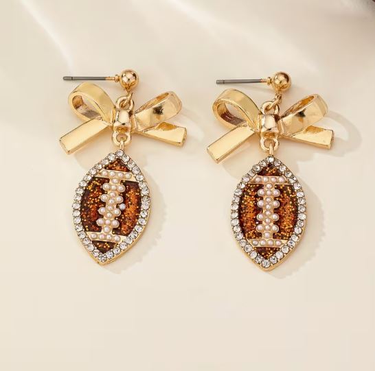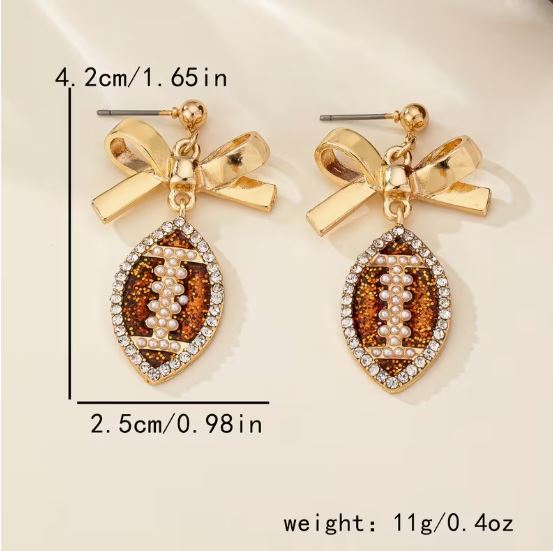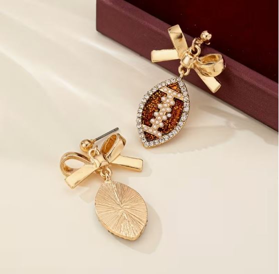 - Design:Â Each earring features a chic gold bow stud at the top, from which dangles an oval, football-shaped charm. The charm face has a glitter enamel finish, with a border of clear rhinestones and a central line of faux pearls simulating the football’s laces.
